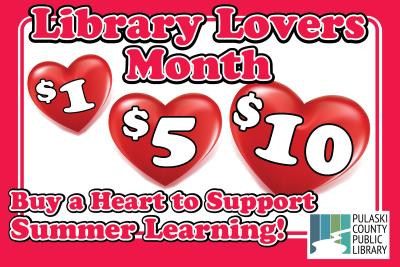 February is Library Lovers Month! Throughout the month, write a name or message on a heart at the library’s main desk for $1, $5, or $10. We’ll display your heart to show your love for the library, and your donation will go directly toward this year’s Summer Reading program.