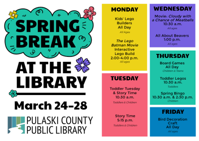 We have events for kids scheduled every day during Spring Break, the week of March 24th! Here's what's coming up: