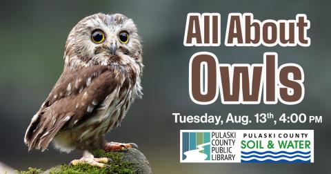Shelley from Pulaski County Soil & Water presented several of our Wild Wednesday programs over the summer, and this month she’s coming back to tell us All About Owls! This kids’ program will be held on Tuesday, August 13th at 4:00 p.m.