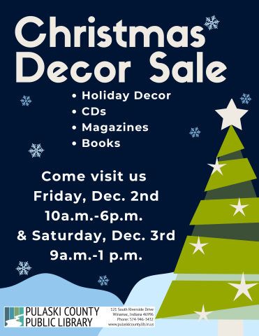 We’re having a major Christmas décor sale at the library on Friday, Dec. 2nd, 10:00 to 6:00 and Saturday, Dec. 3rd, 9:00 to 1:00!