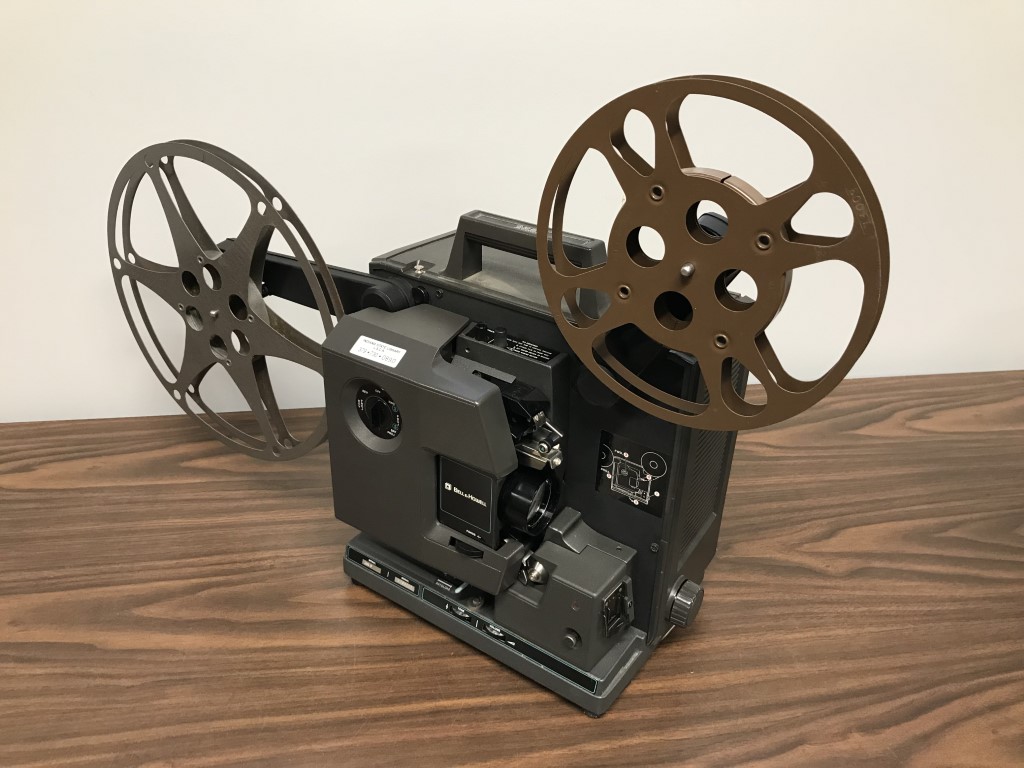 This projector plays reels of 16mm film. Includes cover, 2 take-up reels (large and small), and extra bulb.