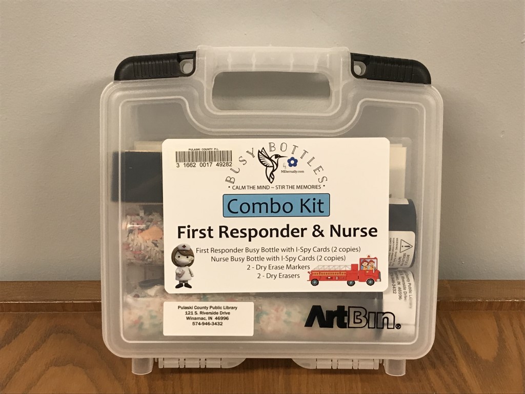 This kit contains First Responder and Nurse busy bottles along with I-Spy cards. Work with a friend to find the hidden treasures in the I-Spy activity, or reminisce over the questions and topics provided.
