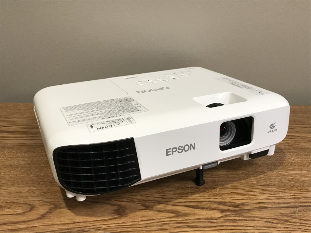 This digital projector can project an image from your laptop, computer, or DVD player. Includes Epson projector, 10-ft HDMI cable, VGA cable, USB cable, power cord, remote, and quick setup instructions.