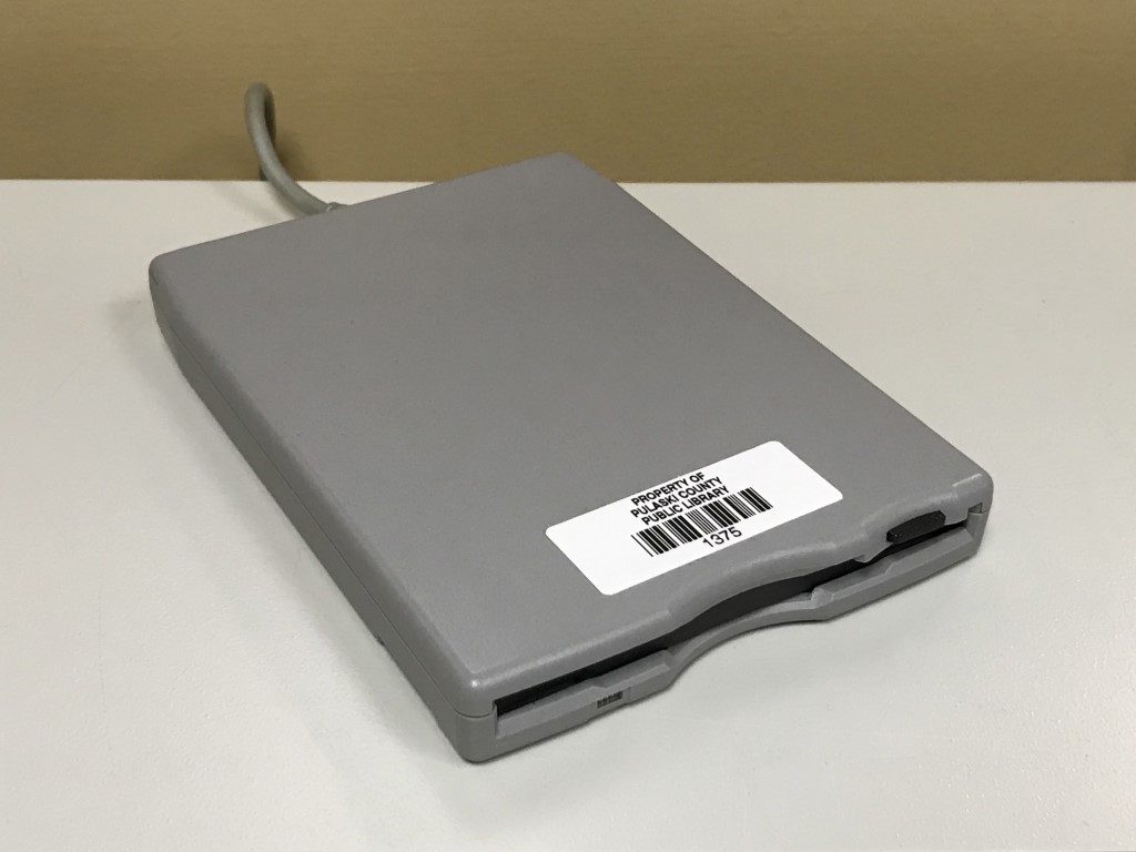 This floppy disk reader reads 3.5" floppies and connects to modern computers via a USB cable.