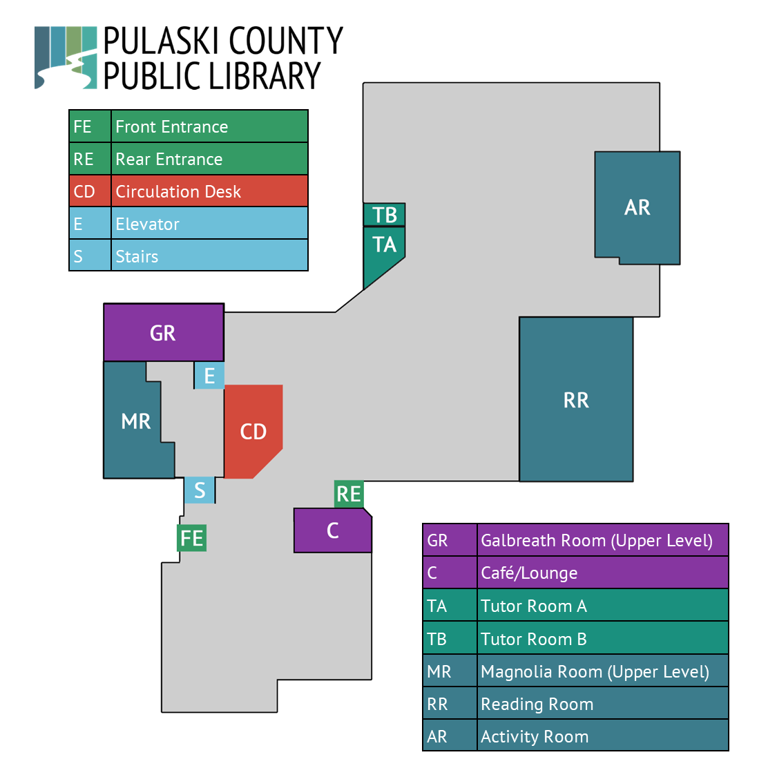 See a diagram of the library's room layout below. Visit our Accessibility page to learn about room accessibility. If you have any questions, feel free to Contact Us.