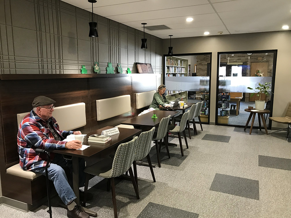 The library’s Café/Lounge is open during regular hours for visitors to take a break or meet with colleagues over a drink or snack. Coffee and tea are provided during the library’s weekly Coffee & Conversation program on Wednesdays. At other times, you are welcome to bring your own drink. This is the only public area of the library in which food is permitted.